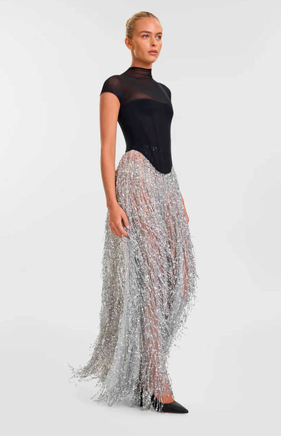 Black Corset Top with Silver Fringe Maxi Skirt Dress