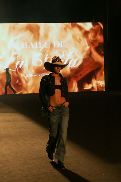 “En El Baile de la Vida, Love by Zuleima viste la palma de iraca con cristales esmeralda y destellos iridiscentes: un sombrero que irradia frescura y vitalidad en cada movimiento.”